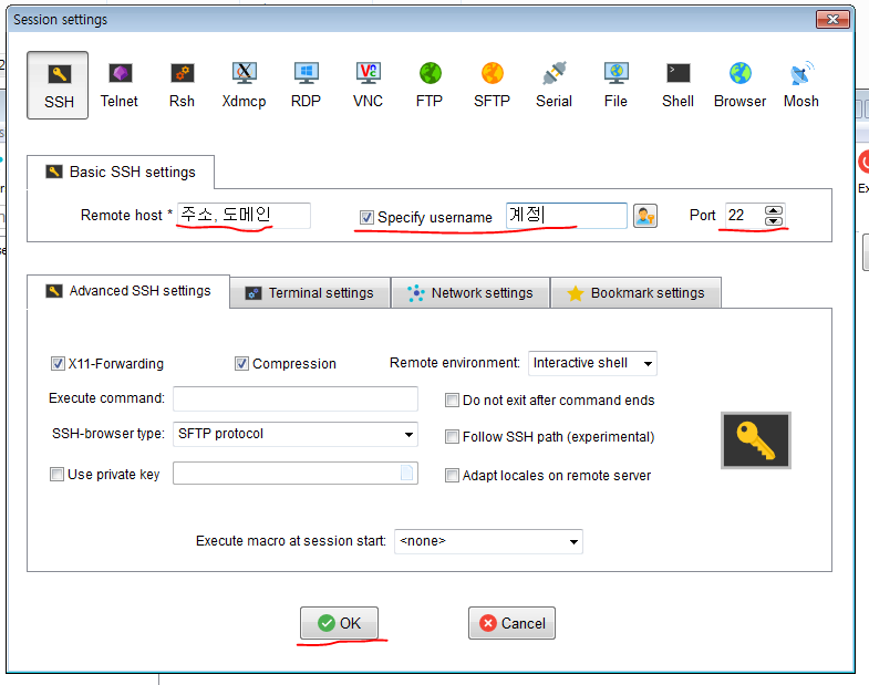 👉 주소, 계정, 포트를 입력후 O.K !