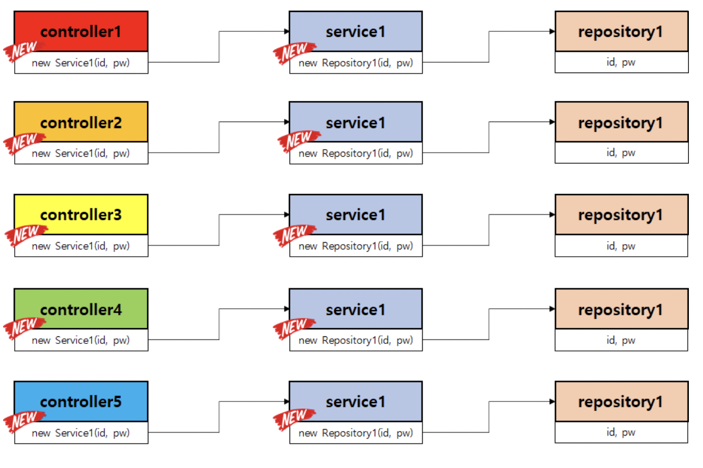 위에서 Repository1의 코드가 변경되어서 아래 처럼 모든 Controller를 수정해야하는 경우가 발생한다.