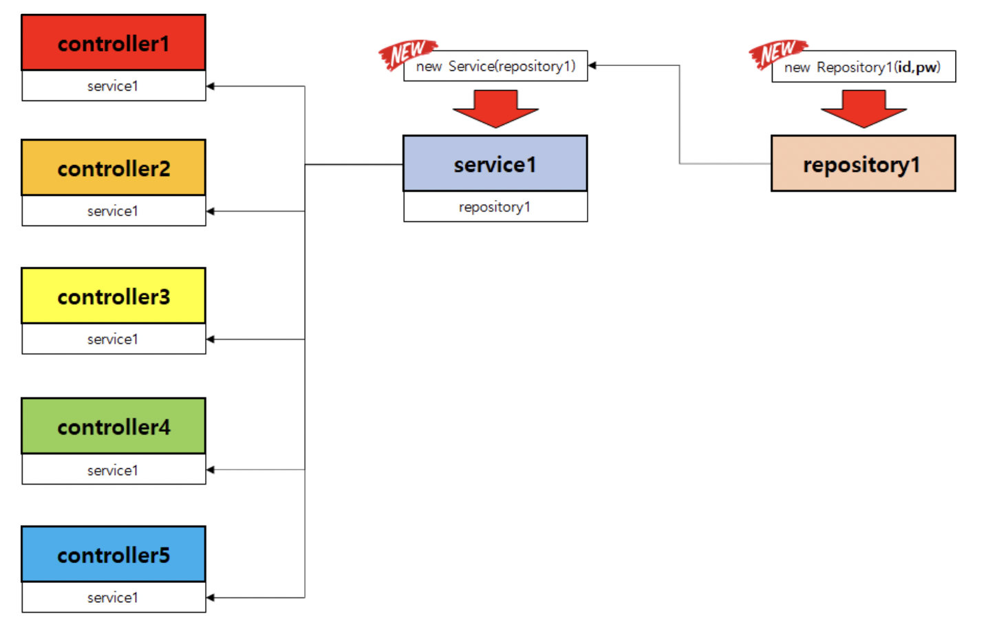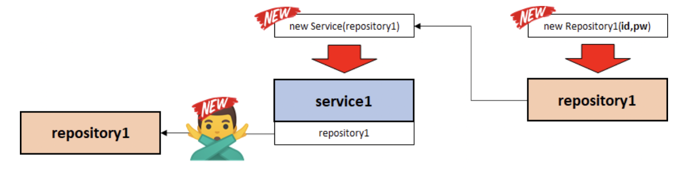 위 방법을 적용하려면, repository1에서 new 객체를 생성하고 Service와 Controller는 생성되어있는 객체를 사용하기만 하면되는 것이다.