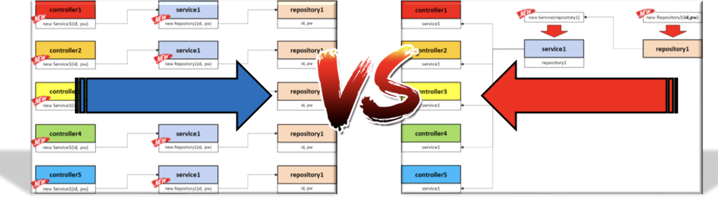 오른쪽은 Repository에서 생성된 객체를 Service에서 재사용해서 Service를 생성하고 다시 Controller에서 Service를 재사용 했다.