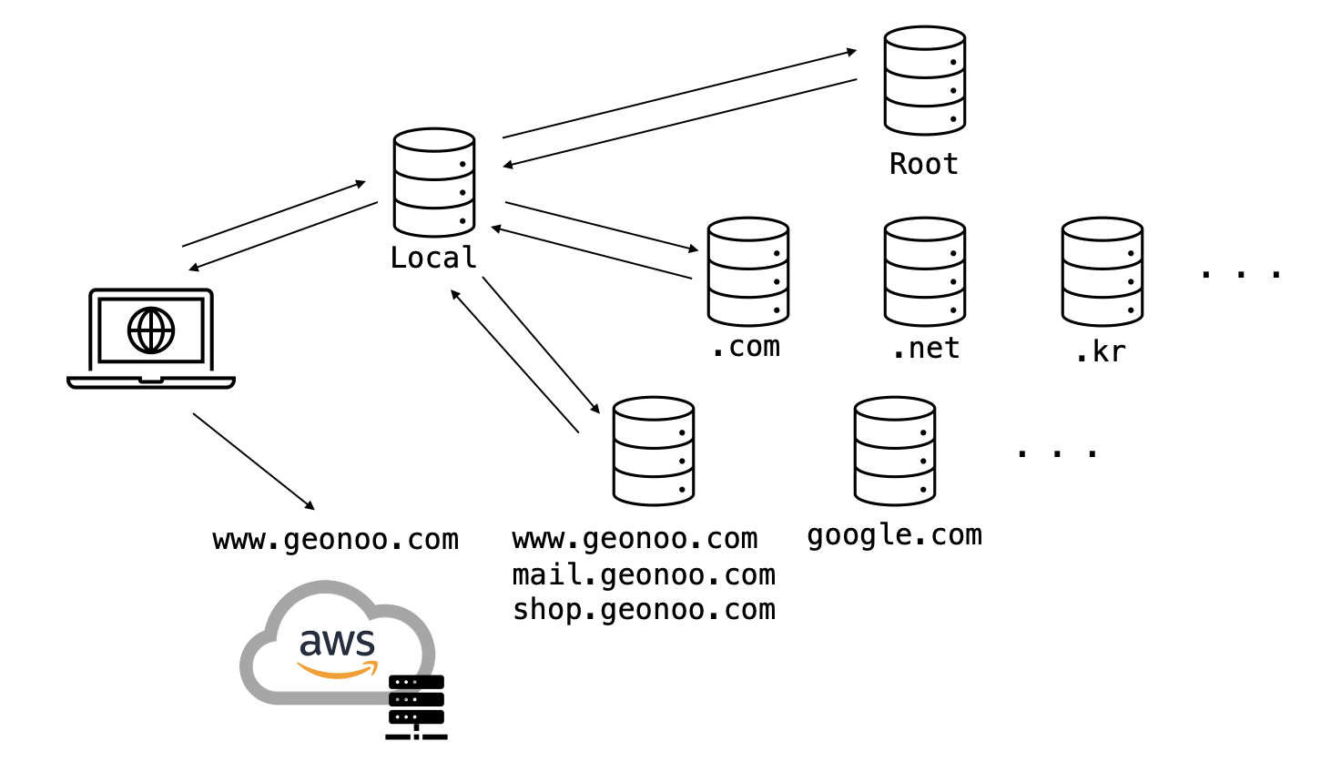 그럼 .com DNS서버는 geonoo.com 이 모여있는 DNS 서버 IP를 반환할 것이고 Local DNS 서버는 해당 IP에가서 최종적으로 www.geonoo.com 을 찾을 수 있을 것이다.