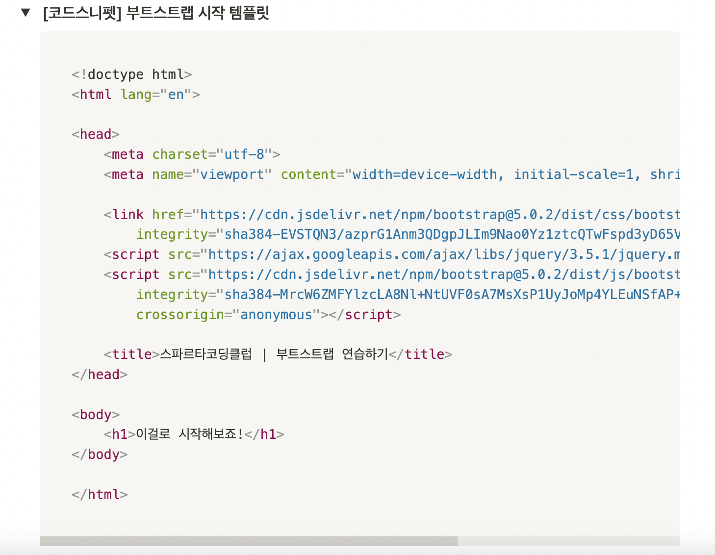 이렇게 샘플코드를 주고 수강생들을 body안 만 채워서 부트스트랩을 쉽게 사용할 수 있게 했다.